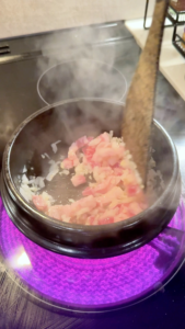 - Sauté the base: Heat oil in a small pot over medium heat. Add the pork belly and cook until golden and slightly crispy. Add the onion and garlic and cook for 1-2 minutes until fragrant.