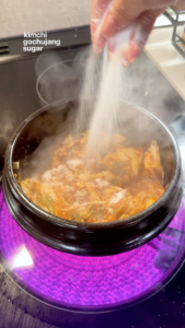 - Add flavor: Stir in gochujang, chopped kimchi, and sugar. Cook for 1-2 minutes to deepen the flavor.